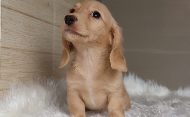 イエロー(クリーム)色の毛色のダックスフンドの子犬を紹介しています。